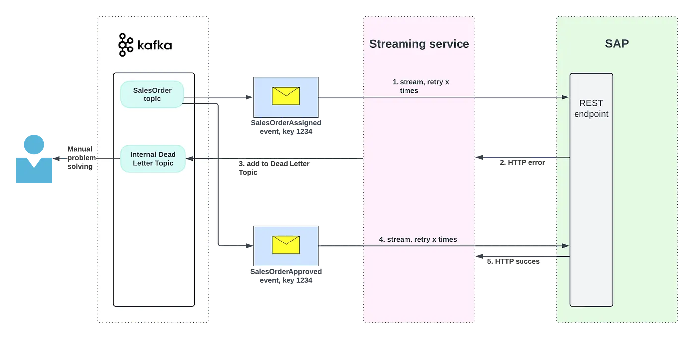 If the SalesOrderAssigned event fails due to an HTTP error, it will land in the DLT, so it doesn’t block all the following events from that partition. However, the SalesOrderApproved event might still be processed by SAP before the assignment information is eventually retried and processed. This creates inconsistent data.